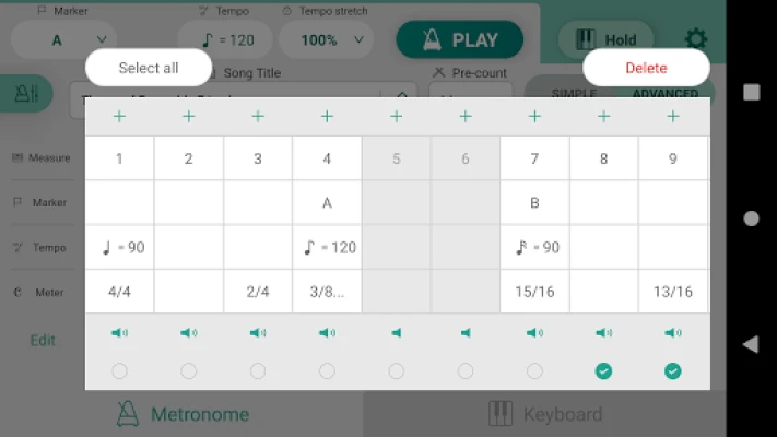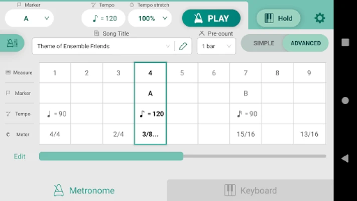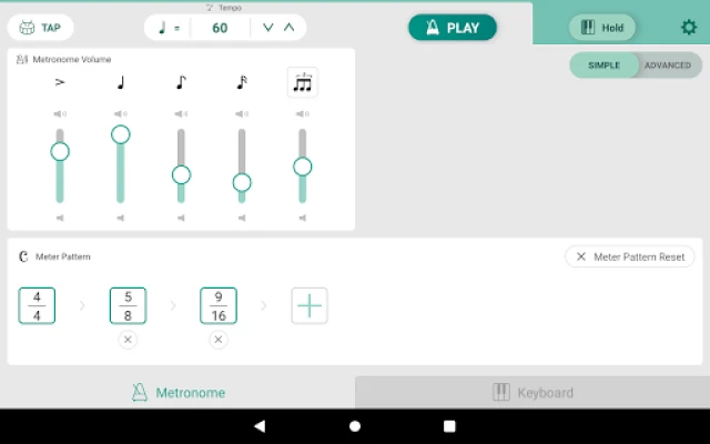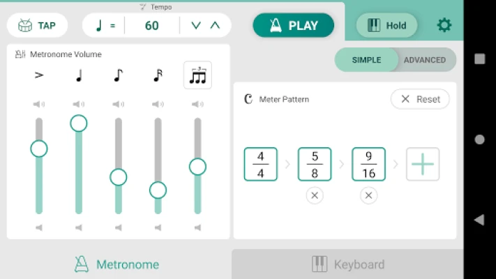 - Metronome can play different rhythm at the same time, and you can change the volume of each rhythm.